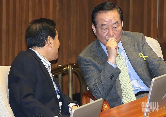 20일, 서울 여의도 국회 본회의장에서 열린 세월호 침몰사고 긴급현안질문에서 새누리당 이재오-서청원 의원이 잠시 이야기를 나누고 있다.
