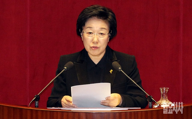 한명숙 새정치민주연합 의원이 21일 서울 여의도 국회에서 열린 본회의에서 세월호 침몰사고에 대해 긴급현안질문을 하고 있다.