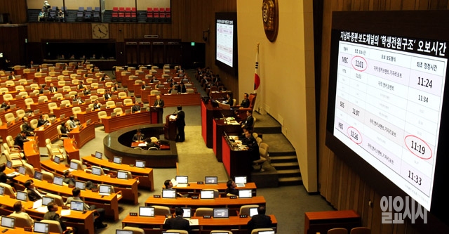 최민희 새정치민주연합 의원이 21일 서울 여의도 국회에서 열린 본회의에서 세월호 침몰사고에 대한 긴급현안질문 도중 각 방송사의 '학생전원구조' 오보시간을 공개하고 있다.