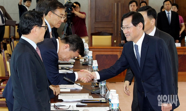 김진태 검찰총장(오른쪽)이 21일 서울 서초동 대검찰청에서 열린 이른바 '관피아'로 불리는 민·관 유착 비리 척결을 위한 전국 검사장 회의에 참석, 검사장들과 인사를 나누고 있다.