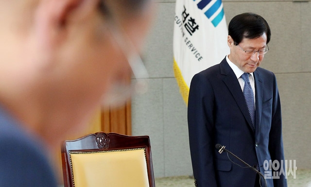 김진태 검찰총장이 21일 서울 서초동 대검찰청에서 열린 이른바 '관피아'로 불리는 민·관 유착 비리 척결을 위한 전국 검사장 회의에서 세월호 희생자에 대한 묵념을 하고 있다.