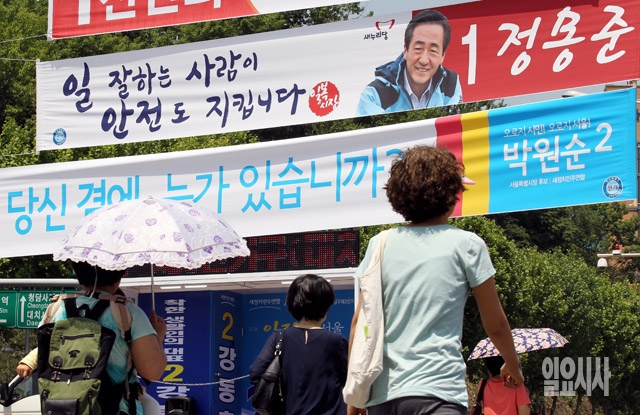 6·4 지방선거 공식 선거운동이 시작된 22일 서울 강남구의 한 거리에 각 후보들의 선거 현수막이 내걸려 있다.