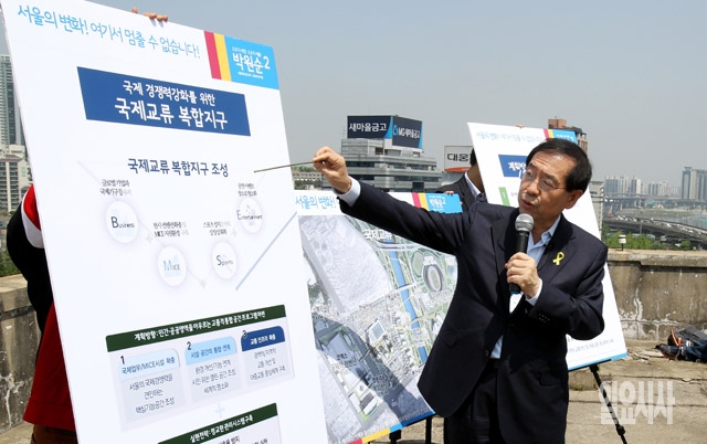 박원순 새정치민주연합 서울시장 후보가 22일 서울 삼성동 구 한국감정원 부지 옥상에서 영동권 종합발전 계획을 발표하고 있다.