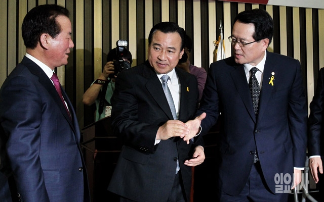 23일 서울 여의도 국회에서 열린 '19대 국회 후반기 당 국회의장·부의장 후보자 선출 선거' 새누리당 의원총회에서 국회부의장 후보자로 선출된 정갑윤 의원(왼쪽부터), 이완구 원내대표, 국회의장 후보자로 선출된 정의화 의원이 악수하고 있다.
