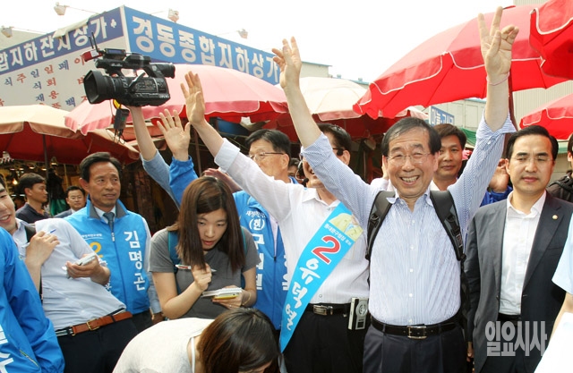 박원순 새정치민주연합 서울시장 후보가 23일 서울 제기동 경동시장을 찾아 시민들에게 지지를 호소하고 있다.