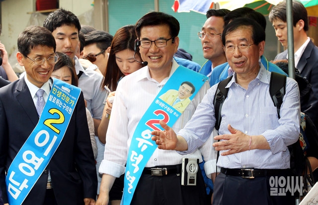 박원순 새정치민주연합 서울시장 후보가 23일 서울 제기동 경동시장을 동대문구 후보들과 함께 둘러보고 있다. 사진 오른쪽부터 박원순 서울시장 후보, 유덕열 동대문구청장 후보, 이영남 동대문구의회의원 후보.