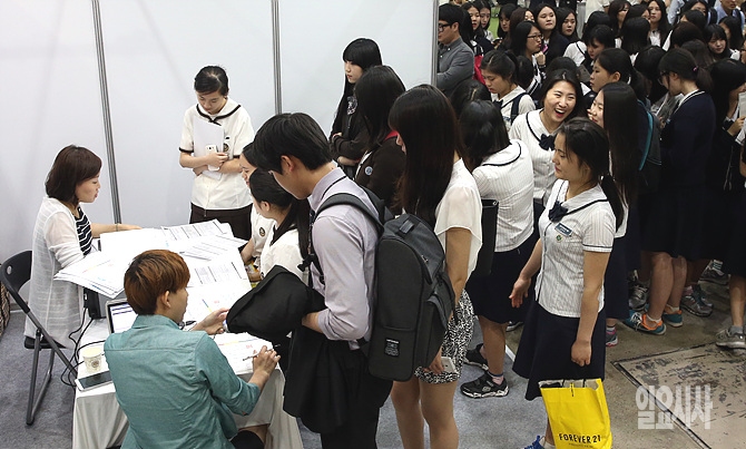 서울 강남구 삼성동 코엑스에서 26일, 열린 '2014 청년일자리 박람회'에서 학생들이 입장 순서를 기다리고 있다.
