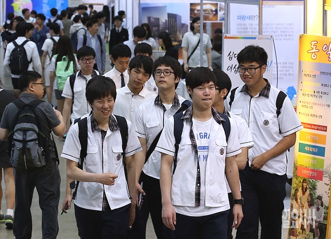 서울 강남구 삼성동 코엑스에서 26일, 열린 '2014 청년일자리 박람회'장에 남학생들이 다른 코너로 이동하고 있다.