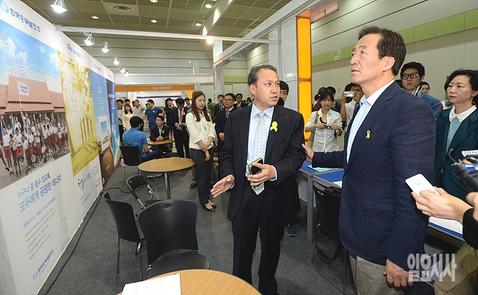 26일, 새누리당 정몽준 서울후보가 서울 코엑스 취업박람회장을 찾아 한 중소기업 관계자로부터 설명을 듣고 있다.