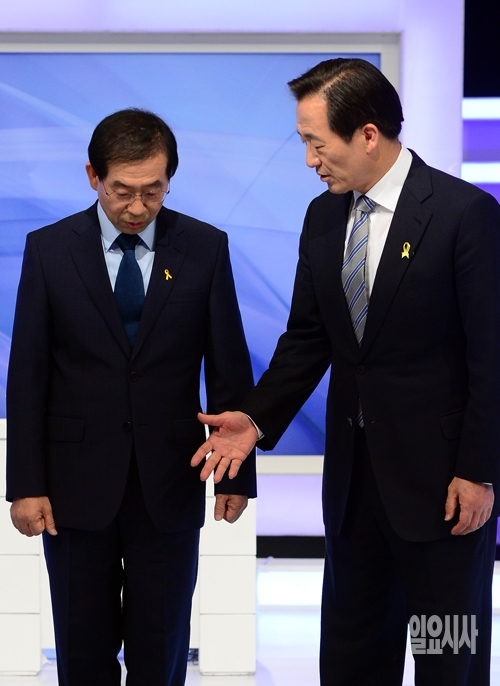 26일 서울 여의도 MBC 스튜디오에서 열린 서울시장 후보 TV토론회에서 새누리당 정몽준 후보(오른쪽)가 새정치민주연합 박원순 후보에게 자리를 안내하고 있다. (사진공동취재단)