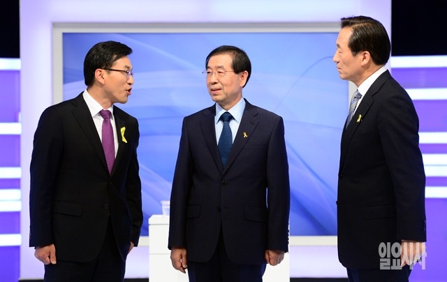 26일 서울 여의도 MBC 스튜디오에서 열린 TV토론회에서 새누리당 정몽준(오른쪽부터), 새정치민주연합 박원순, 통합진보당 정태흥 서울시장 후보가 이야기를 나누고 있다. (사진공동취재단)