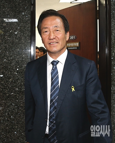 27일 오전, 새누리당 정몽준 서울시장 후보가 아무런 일정도 없는 새정치민주연합 원내대표실을 방문 직후 흡족해보이는 웃음을 짓고 있다.