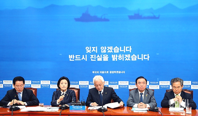 27일 오전, 서울 여의도 새정치민주연합 원내대표실 단상 뒷면에 세월호 참사 관련 문구가 적혀져 있다.