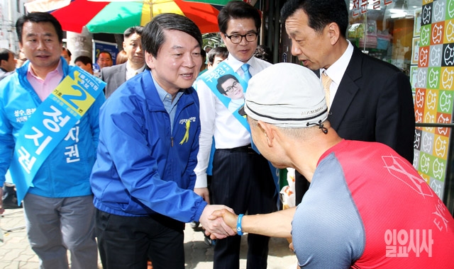안철수 새정치민주연합 공동대표가 27일 서울 성동구 성수동 뚝도시장을 찾아 정원오 성동구청장 후보와 함께 상인들을 만나 인사를 나누고 있다.