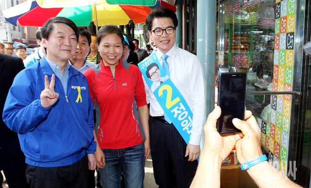 안철수 새정치민주연합 공동대표가 27일 서울 성동구 성수동 뚝도시장을 찾아 정원오 성동구청장 후보와 함께 상인들을 만나 기념촬영을 하고 있다.