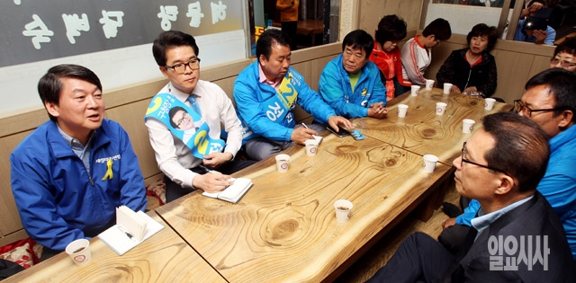 안철수 새정치민주연합 공동대표가 27일 서울 성동구 성수동 뚝도시장에서 정원오 성동구청장 후보를 비롯한 지역 상인들과 간담회를 갖고 있다.