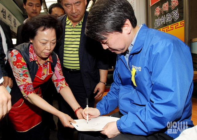 안철수 새정치민주연합 공동대표가 27일 서울 성동구 성수동 뚝도시장에 방문, 지역상인들에게 사인을 해주고 있다.