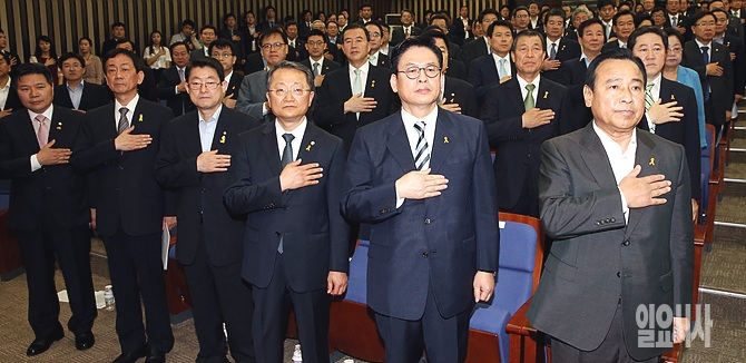 27일, 새누리당 의원들이 서울 여의도 국회 의원회관서 열린 '19대 국회 하반기 상임위원장단 선출 의원총회' 직전, 국기에 대한 경례를 하고 있다.