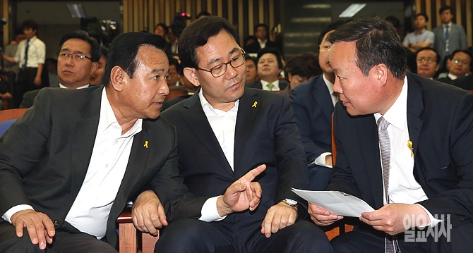 27일, 서울 여의도 국회 의원회관서 열린 '19대 국회 하반기 새누리당 상임위원장단 선출 의원총회'에서 이완구 원내대표-주호영 정책위의장-김재원 원내수석부대표(사진 왼쪽부터)가 이야기를 나누고 있다.