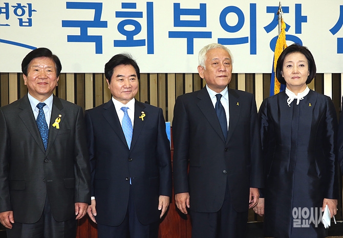 야당몫 국회부의장 선출을 위한 새정치민주연합 의원총회가 27일 오후, 서울 여의도 국회에서 열린 가운데 선출 직후 이석현 당선자(사진 왼쪽에서 두 번째)가 박병석 현 국회부의장(사진 왼쪽), 김한길 공동대표·박영선 원내대표와 기념촬영을 하고 있다.