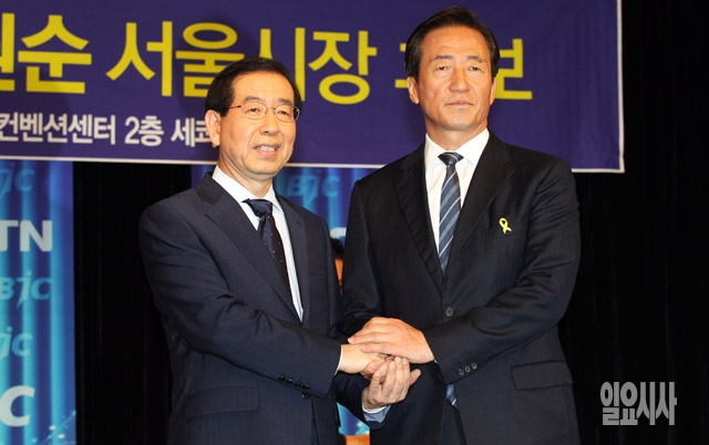 정몽준 새누리당 서울시장 후보(오른쪽)와 박원순 새정치민주연합 서울시장 후보가 28일 서울 여의도 63빌딩에서 열린 한국방송기자클럽 초청 토론회에서 인사를 나누고 있다.