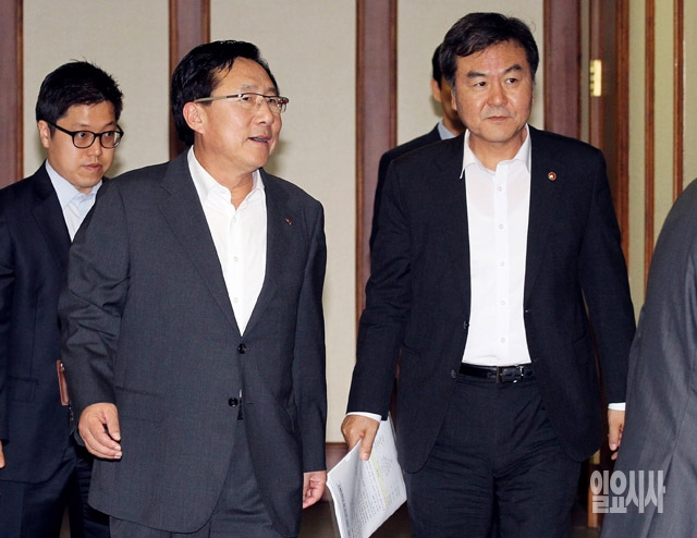 28일 서울 여의도 중소기업중앙회에서 열린 '중소기업 금융규제 개선을 위한 간담회'에 신제윤 금융위원장(오른쪽)과 김기문 중소기업중앙회장이 참석하고 있다.