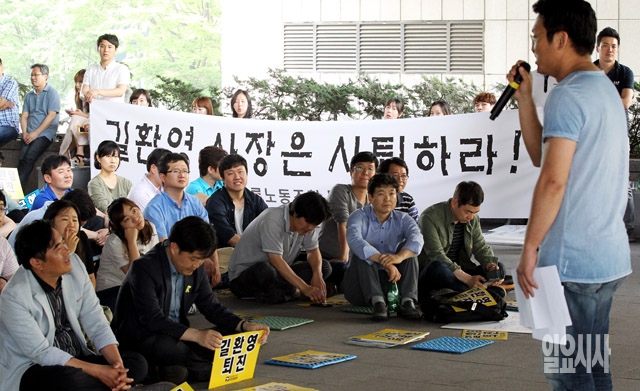 길환영 KBS 사장 해임제청안 이사회가 열린 28일 서울 여의도 KBS 신관 앞에서 KBS 조합원들이 길사장의 사퇴를 촉구하는 집회를 갖고 있다.