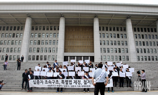 세월호 참사 유가족들이 28일 서울 여의도 국회 본청 앞 계단에서 피켓을 들고 여야를 향해 조속한 국정조사를 요구하고 있다.