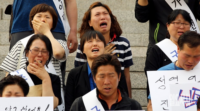 세월호 참사 유가족들이 28일 서울 여의도 국회 본청 앞 계단에서 피켓을 들고 여야를 향해 조속한 국정조사를 요구하고 있다.