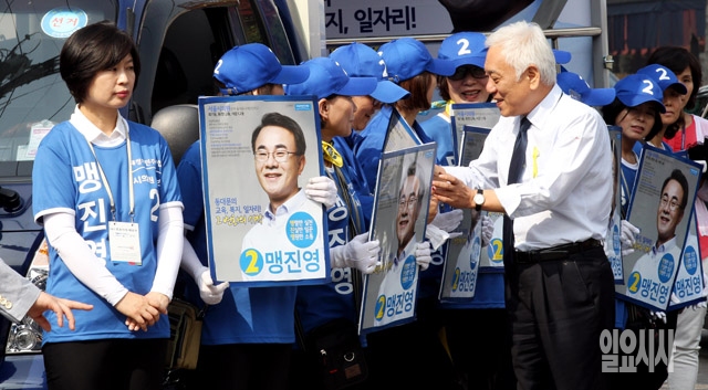 김한길 새정치민주연합 공동대표가 29일 서울 동대문구 휘경동을 방문, 각 후보들 선거유세단들과 인사를 나누고 있다.
