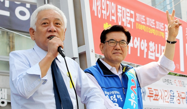 김한길 새정치민주연합 공동대표(왼쪽)가 29일 서울 동대문구 휘경동을 방문, 유덕열 동대문구청장 후보와 함께 시민들에게 지지를 호소하고 있다.