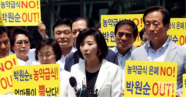 나경원 새누리당 선거대책위 부위원장이 29일 서울시청 정문 앞에서 열린 정몽준 서울시장 후보 및 25개 구청장 후보들의 농약급식 관련 합동기자회견에서 발언을 하고 있다.