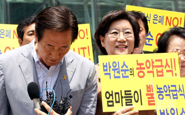 29일 서울시청 정문 앞에서 열린 새누리당 서울시장 후보 및 25개 구청장 후보들의 농약급식 관련 합동기자회견에서 정몽준 후보(왼쪽)가 인사를 하고 있다.