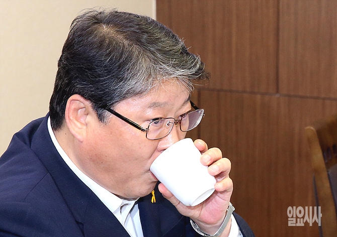 29일 오후, 서울 여의도 국회 의원회관에서 새누리당 조원진 세월호 국조특위 여당 간사가 증인채택을 포함한 국정조사 계획서 채택을 위한 회동에서 목이 타는 듯 물을 들이키고 있다.