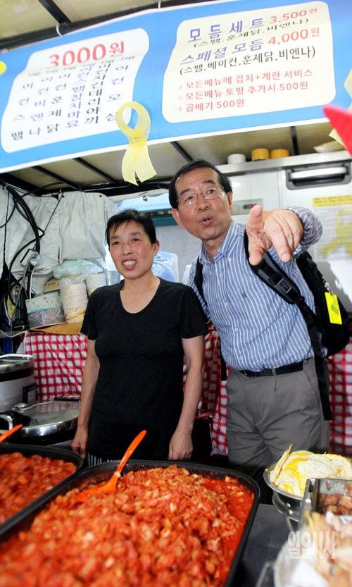 박원순 새정치민주연합 서울시장 후보가 29일 서울 동작구 노량진을 방문, 컵밥 노점상인과 대화를 나누고 있다.