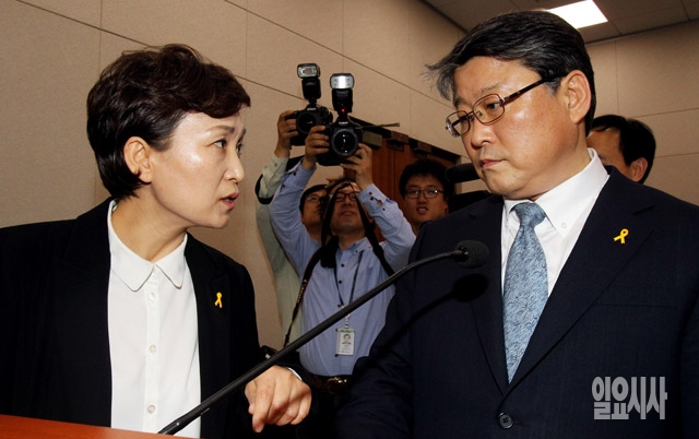 29일 서울 여의도 국회에서 열린 세월호 침몰사고의 진상 규명을 위한 국정조사특별위원회 전체회의에서 여야 간사인 새누리당 조원진(오른쪽), 새정치민주연합 김현미 의원이 논의를 하고 있다.