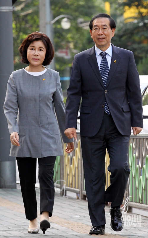 박원순 새정치민주연합 서울시장 후보가 30일 서울 구로구 구로3동주민센터에 마련된 사전투표소에 부인 강난희씨와 사전투표를 하기 위해 들어서고 있다.