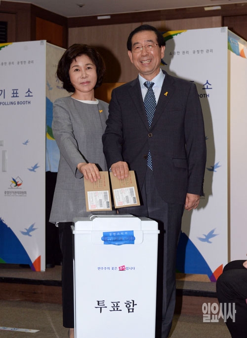 박원순 새정치민주연합 서울시장 후보가 30일 서울 구로구 구로3동주민센터에 마련된 사전투표소에 사전투표를 하고 있다.