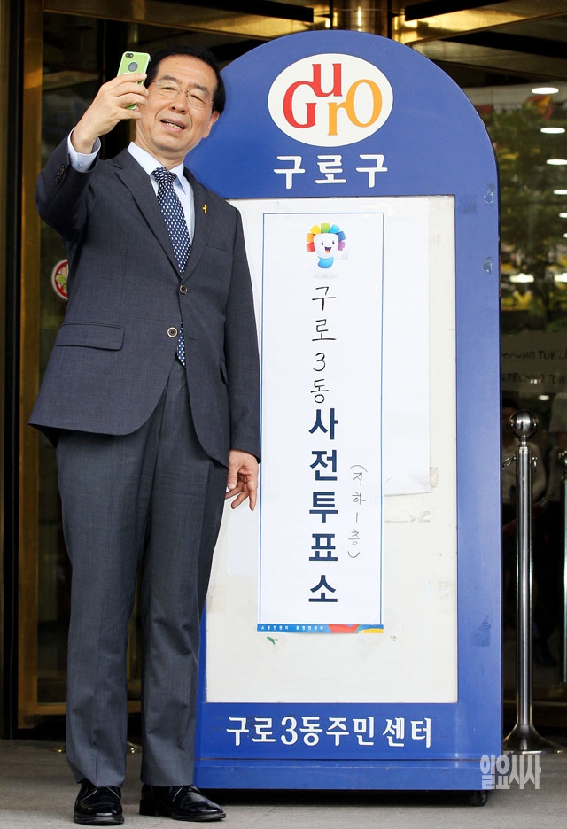 박원순 새정치민주연합 서울시장 후보가 30일 서울 구로구 구로3동주민센터에 마련된 사전투표소에서 사전투표를 마친 뒤 인증사진을 촬영하고 있다.