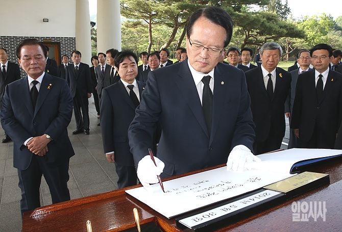 30일 오전, 정의화 국회의장이 정갑윤·이석현 국회부의장 등 19대 후반기 국회의장단과 함께 서울 동작구 국립현충원을 방문한 자리에서 방명록을 작성하고 있다.