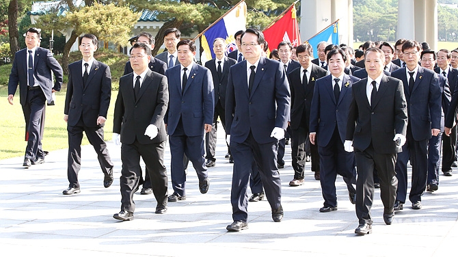 30일 오전, 정의화 국회의장, 정갑윤·이석현 국회부의장 등 19대 후반기 국회의장단이 서울 동작구 국립현충원 참배를 위해 입장하고 있다.