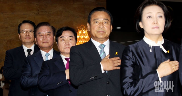 30일 서울 여의도 국회 중앙홀에서 열린 제66주년 국회 개원 기념식에서 신임 국회의장단과 여야 원내대표가 국기에 대한 경례를 하고 있다. 사진 왼쪽부터 정의화 국회의장, 정갑윤, 이석현 국회부의장, 이완구 새누리당 원내대표, 박영선 새정치민주연합 원내대표.