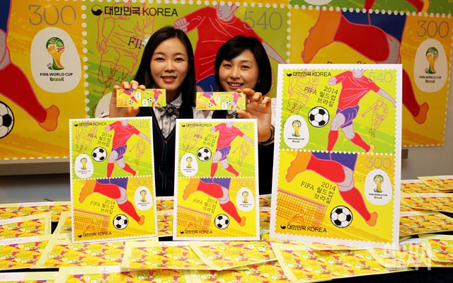 우정사업본부가 2일 서울 중구 포스트타워에서 2014 FIFA 브라질 월드컵 기념우표를 2종을 선보이고 있다. 이번에 발행된 브라질 월드컵 기념우표는 청색 팬츠에 빨간 상의와 스타킹을 신은 태극전사가 거침없이 드리블을 하는 모습을 담고 있다.