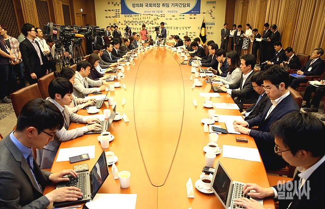 2일, 서울 여의도 국회 접견실에서 정의화 국회의장이 취임기자간담회를 갖고 있는 가운데, 국내 취재진의 취재 열기가 뜨겁다.