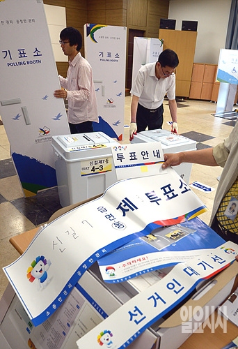 선관위 관계자들이 6·4 지방선거를 하루 앞둔 3일 오전, 서울 영등포구 신길7동 주민센터에 마련된 제3투표소에서 투표지 기표에 사용할 기표 용구 등을 점검하고 있다.