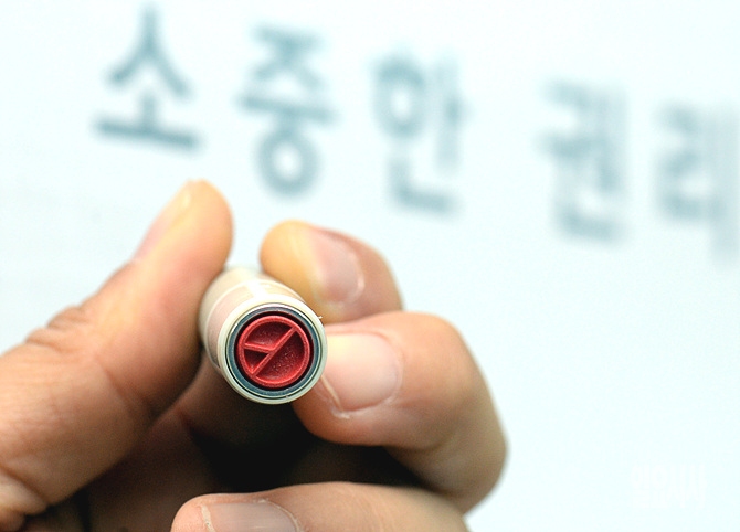 선관위 관계자들이 6·4 지방선거를 하루 앞둔 3일 오전, 서울 영등포구 신길7동 주민센터에 마련된 제3투표소에서 투표지 기표에 사용할 기표 용구 등을 점검하고 있는 가운데, 투표 도장을 들어보이고 있다.