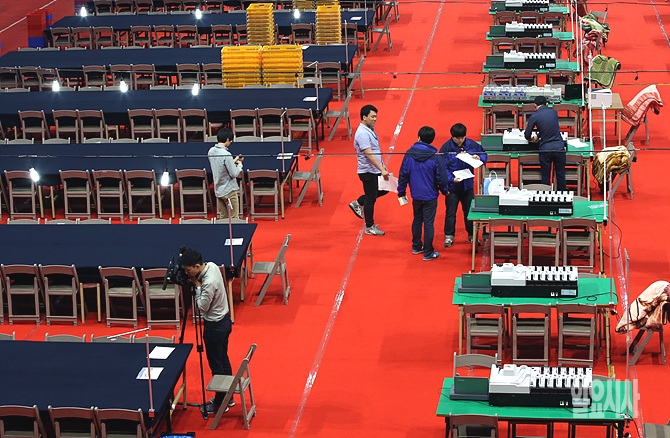 6·4 지방선거를 하루 앞둔 3일 오후, 서울 목동아이스링크에 마련된 개표소에 신형 투표기들이 설치돼 있다.