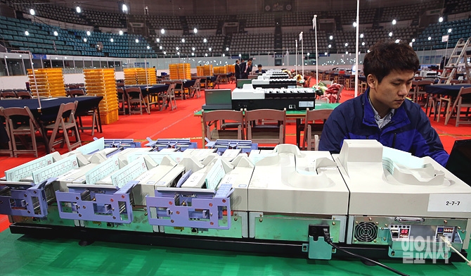 6·4 지방선거를 하루 앞둔 3일 오후, 개표 요원들이 서울 목동아이스링크에 마련된 개표소에서 신형 투표지 분류기를 점검하고 있다.