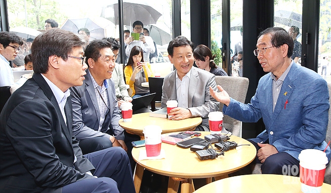 박원순 새정치민주연합 서울시장 후보가 6.4지방선거를 하루 앞둔 3일, 서울 여의도의 한 카페에서 50대 직장인과의 티타임 시간을 갖고 있다.