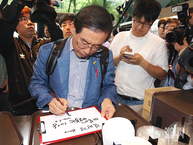박원순 새정치민주연합 서울시장 후보가 6.4지방선거를 하루 앞둔 3일, 서울 여의도의 한 카페에서 한 시민에게 즉석으로 사인을 해주고 있다.